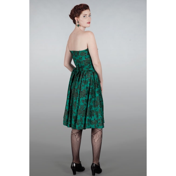 L'abito prosegue con un corpetto rinforzato con stecche e la gonna a ruota che termina subito sotto il ginocchio. La linea dell'abito dona una particolare forma a clessidra che sottolinea il punto vita e valorizza le forme. Una zip nascosta sul retro lo rende facile da indossare, e delle tasche nascoste lo rendono estremamente pratico.