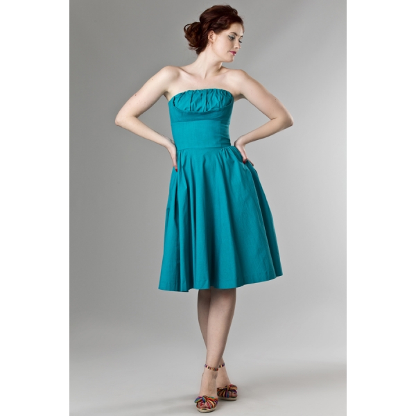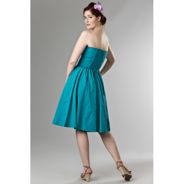 Salta subito all'occhio l'elaborato dettaglio all'altezza del seno, che sottolinea le curve e rende l'abito comodo da indossare in ogni taglia. Il corsetto è rinforzato con delle stecche per mantenere l'abito aderente e sottolineare il punto vita. L'abito è senza spalline, ma delle spalline rimovibili sono comprese e lo rendono estremamente versatile.