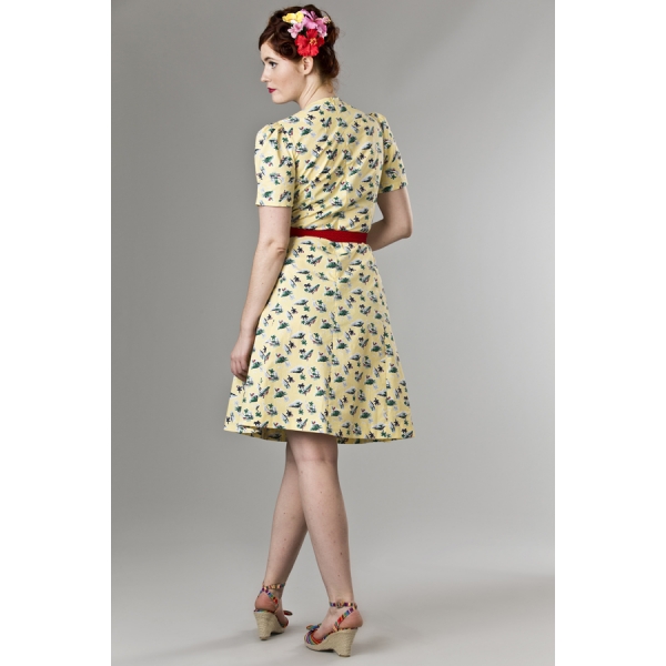 La linea è classica ed elegante, con un piccolo scollo a cuore e una gonna a trapezio. Tessuto in cotone, giallo con una stampa di piccole isole tropicali.
