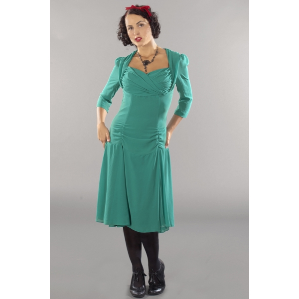 Abito con scollo a cuore, che presenta una particolare lavorazione all'altezza del seno, dove la stoffa è arriciata e incrociata. Anche le spalle sono arricciate, rendendo le maniche a tre quarti leggermente a sbuffo. I dettagli sui fianchi, sia davanti che sul retro, sottolineano il punto vita e definiscono la figura.