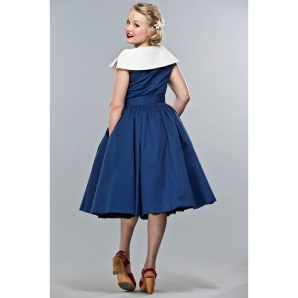Abito in perfetto stile anni '50, con scollo a barchetta e gonna a ruota. Un grappolo di fragoline decora il grande collo bianco dell'abito, ricamate in a contrasto con un filo spesso e resistente. Il collo presenta due piccoli spacchi all'altezza delle spalle, così da rendere più facili i movimenti.