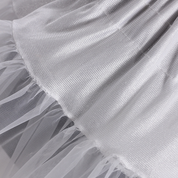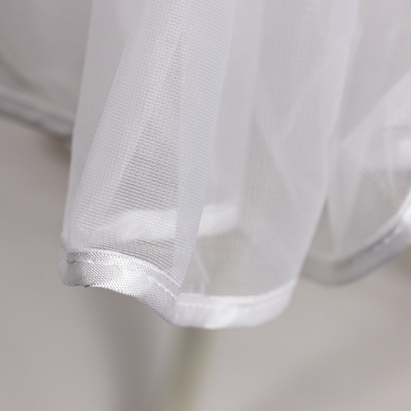 Sottogonna in organza a due veli, con quattro balze e baschina in vita in maglina elasticizzata. Elastico in vita regolabile con bottone e lunghezza regolabile spostando l’elastico in tre diverse posizioni. Elegante rifinitura orlo con nastro di raso.