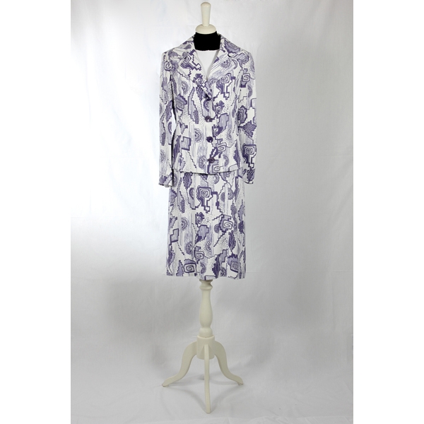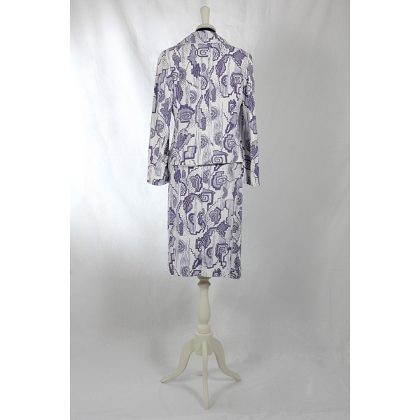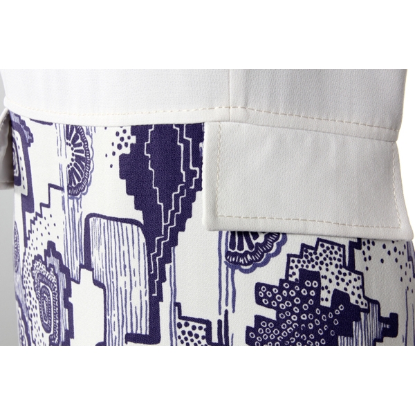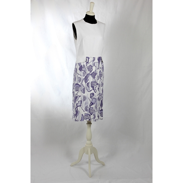 Abito senza maniche con corpetto bianco e tasche applicate. Gonna a fantasia blu come la giacca.