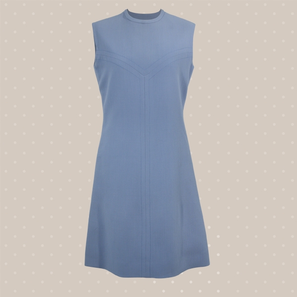 Abito lunghezza al ginocchio senza maniche e scollatura rotonda. Giacchina foderata corta al fianco con patelle laterali, con maniche a tre quarti e bottoni originali.